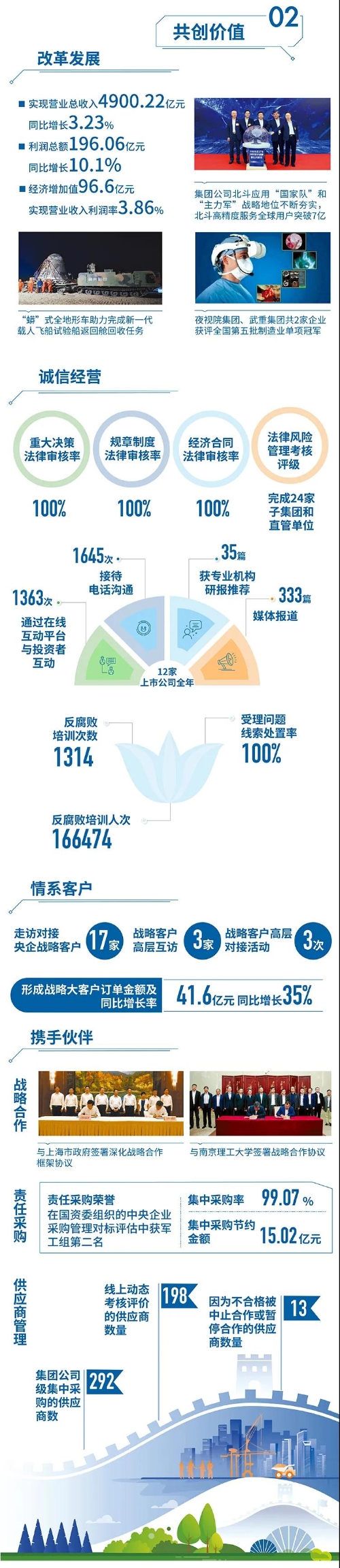 近日,國務(wù)院國資委在京舉辦“責(zé)任創(chuàng)造價值,責(zé)任引領(lǐng)未來——中央企業(yè)社會責(zé)任報告集中發(fā)布活動(2021)”,來自中央企業(yè)的92份《報告》向公眾全面展示央企認(rèn)真履行社會責(zé)任的成果。兵器工業(yè)集團(tuán)參加集中發(fā)布活動,并向社會公眾正式發(fā)布第十二份年度社會責(zé)任報告——《中國兵器工業(yè)集團(tuán)有限公司2020年社會責(zé)任報告》,全面披露2020年度集團(tuán)公司履責(zé)實踐和履責(zé)成效。會上發(fā)布了《中央企業(yè)社會責(zé)任藍(lán)皮書(2021)》,《中國兵器工業(yè)集團(tuán)有限公司:內(nèi)化于心外化于行,打造央企責(zé)任管理表率》成功入選典型案例。 2020年,是“十三五”規(guī)劃收官之年,也是全面建成小康社會、實現(xiàn)第一個百年目標(biāo)的決勝之年。集團(tuán)公司黨組書記、董事長焦開河在報告開篇指出,集團(tuán)公司實現(xiàn)了“十三五”圓滿收官,整體步入了高質(zhì)量發(fā)展軌道,呈現(xiàn)出基礎(chǔ)更牢、動力更強(qiáng)、空間更大、效能更高的積極向上良好態(tài)勢。在“十三五”特別是近三年來的工作實踐中,我們明確了“集團(tuán)公司是國家安全和國防建設(shè)的脊梁、是國家戰(zhàn)略科技力量最為重要的組成部分、是黨和國家最可信賴的‘六個力量’,肩負(fù)著支撐國防軍隊建設(shè)、推動科技自立自強(qiáng)、服務(wù)構(gòu)建新發(fā)展格局的重大政治責(zé)任和光榮使命,具有極強(qiáng)的政治屬性,性質(zhì)特殊、使命特殊、責(zé)任特殊”的新時代新階段職責(zé)使命,深化了對“堅持以習(xí)近平新時代中國特色社會主義思想定向領(lǐng)航,是集團(tuán)公司高質(zhì)量發(fā)展的根本遵循;保持貫徹落實習(xí)近平總書記重要指示批示和黨中央決策部署的戰(zhàn)略定力,是集團(tuán)公司高質(zhì)量發(fā)展的根本前提;履行好強(qiáng)軍這個首要職責(zé),是集團(tuán)公司高質(zhì)量發(fā)展的根本要求;加快兵器科技創(chuàng)新突破,是集團(tuán)公司高質(zhì)量發(fā)展的根本支撐;加強(qiáng)黨的領(lǐng)導(dǎo)黨的建設(shè),是集團(tuán)公司高質(zhì)量發(fā)展的根本保證”的兵器工業(yè)改革發(fā)展規(guī)律認(rèn)識。 《報告》聚焦“抗疫斗爭中的‘兵器力量’”,生動展示了集團(tuán)公司抗擊疫情的有力行動,展現(xiàn)了集中力量辦大事、急國家之所急的“兵器速度”,彰顯了“把一切獻(xiàn)給黨”的人民兵工精神和貫徹落實國家決策部署的責(zé)任擔(dān)當(dāng)?!秷蟾妗芬浴坝眯氖睾蚝推健⒂们闇嘏鐣睘橹黝},從恪守本責(zé)、共創(chuàng)價值、致力和諧、踐行綠色、責(zé)任管理五個維度,全面展現(xiàn)集團(tuán)公司在堅持履行政治責(zé)任、經(jīng)濟(jì)責(zé)任、社會責(zé)任,履行強(qiáng)軍首責(zé)、加強(qiáng)黨的建設(shè)、打造國家戰(zhàn)略科技力量、推進(jìn)“一帶一路”倡議、打好打贏三大攻堅戰(zhàn)、深化改革、助力員工成長、支持社會公益事業(yè)、提升社會責(zé)任管理等方面的生動實踐和履責(zé)亮點(diǎn),凸顯集團(tuán)公司保持貫徹落實黨中央決策部署的戰(zhàn)略定力、在聚焦主責(zé)主業(yè)、科技引領(lǐng)、國際化經(jīng)營上持續(xù)用力,為實現(xiàn)第一個百年奮斗目標(biāo)貢獻(xiàn)力量的初心與行動?!秷蟾妗吩俅潍@得中國企業(yè)社會責(zé)任報告評級專家委員會“五星佳”最高評級,兵器工業(yè)集團(tuán)成為軍工行業(yè)唯一連續(xù)10年獲得最高評級的企業(yè)。 2021年是開啟新征程的開局之年,也是建黨100周年、人民兵工創(chuàng)建90周年,兵器工業(yè)集團(tuán)將全面貫徹落實黨中央戰(zhàn)略部署,緊扣推動高質(zhì)量發(fā)展主題,圍繞“十四五”開好局、起好步,堅決完成黨中央賦予的職責(zé)使命,履行好中央企業(yè)和軍工集團(tuán)的政治責(zé)任、經(jīng)濟(jì)責(zé)任、社會責(zé)任,為實現(xiàn)中國夢強(qiáng)軍夢作出新的更大貢獻(xiàn)! 一圖看懂《中國兵器工業(yè)集團(tuán)有限公司2020年社會責(zé)任報告》 |